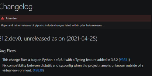 2021年4月26日 pip ver.21.1のバグと対処方法 Pythonを利用する上で欠かせないpipですが,今日セットアップ作業中にpipを最新板にUpdateするとpipコマンドが使えなくなるという状態に陥りました. いろいろ調べてみるとPython(Ver3.6.1)をインストールする時点では問題なく使えるものの、pipをUpgradeすると利用できなくなることがわかり、さらに調べてみるとつい最近の4/24にp... カテゴリー Python
